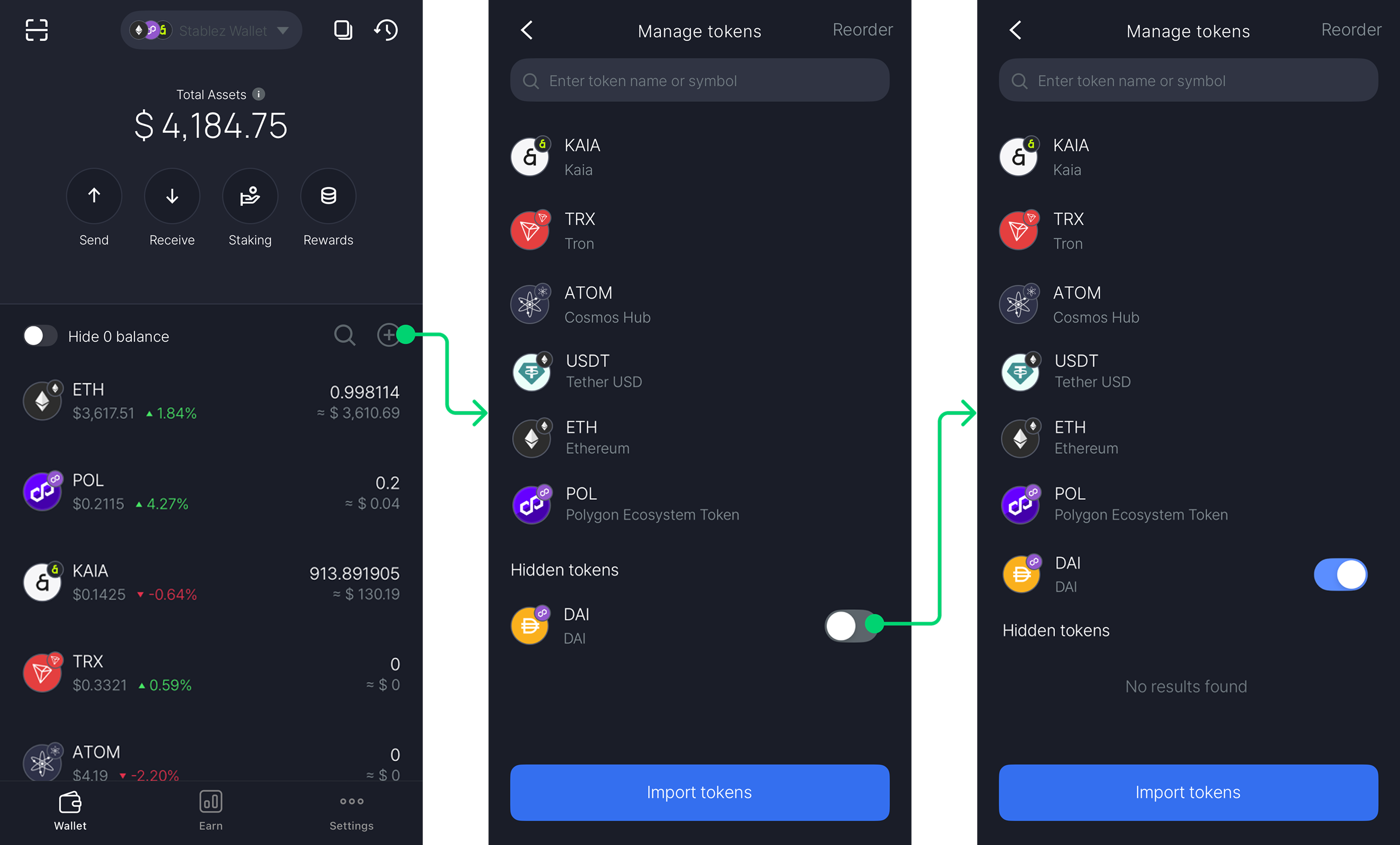 2. Browse and select the token(s) you want to add to your Stablez wallet under "Hidden Tokens" section.
