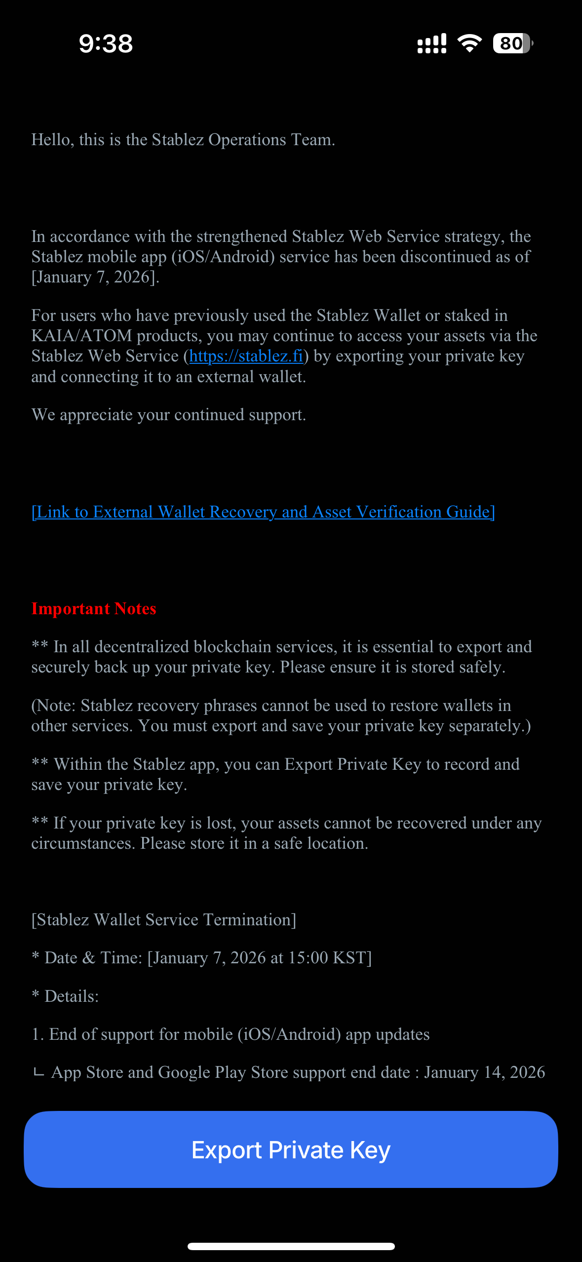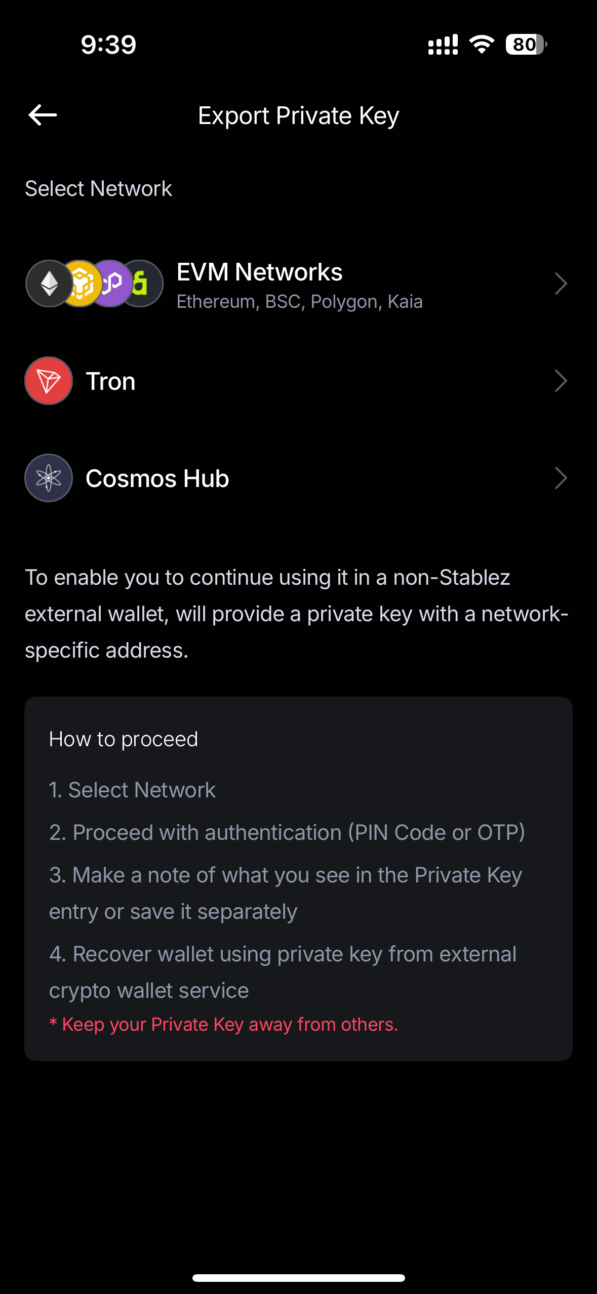 1. Open **Stablez App** and **\[Export Private Key]** button<br>