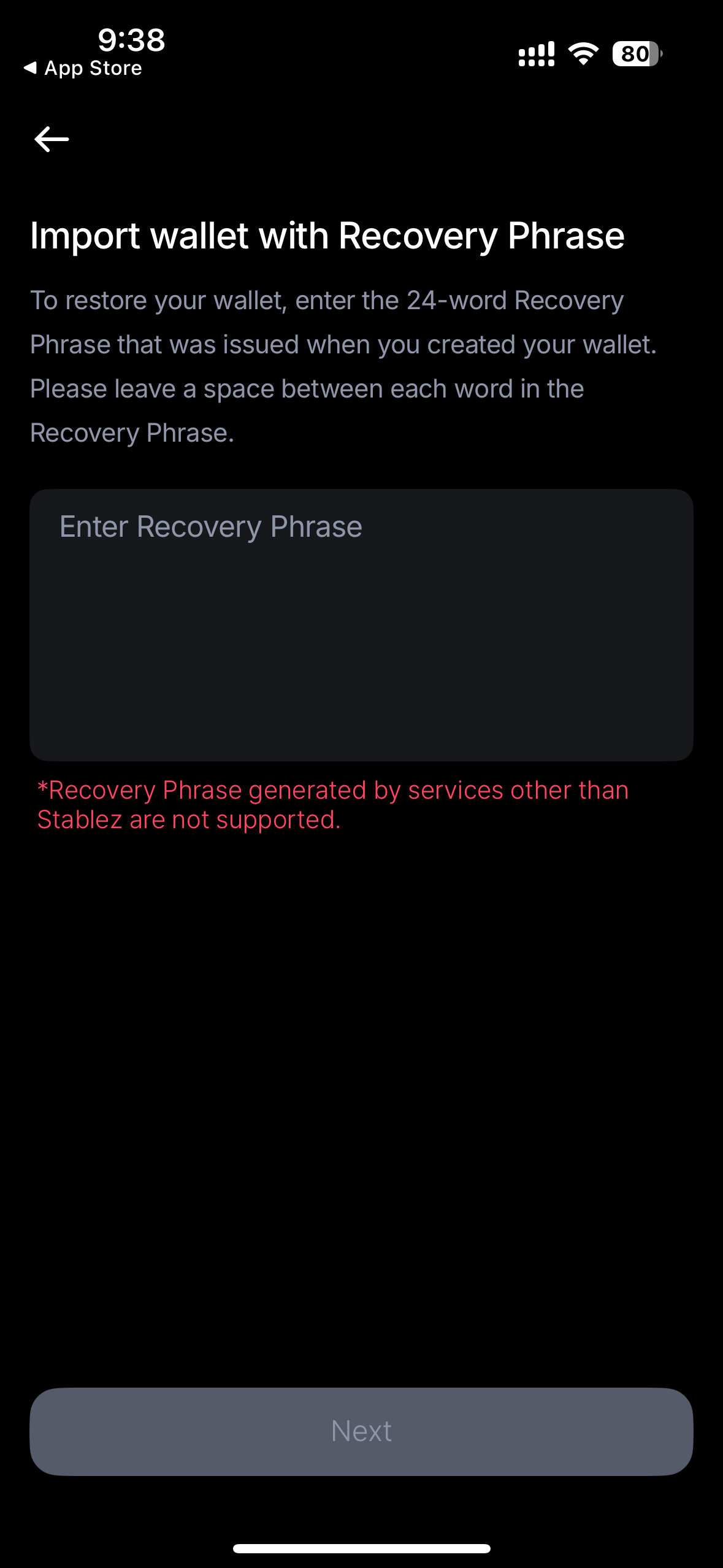 > * You cannot import wallets generated from Stablez with this method. If you wish to use a different Stablez Wallet, you'll need to delete and reinstall the application, then import your wallet following [Import Wallet](https://stablez-1.gitbook.io/stablez-docs/wallet-set-up#id-2.-import-wallet). Be sure to store your recovery phrase or private key in a safe place before reinstalling the wallet.