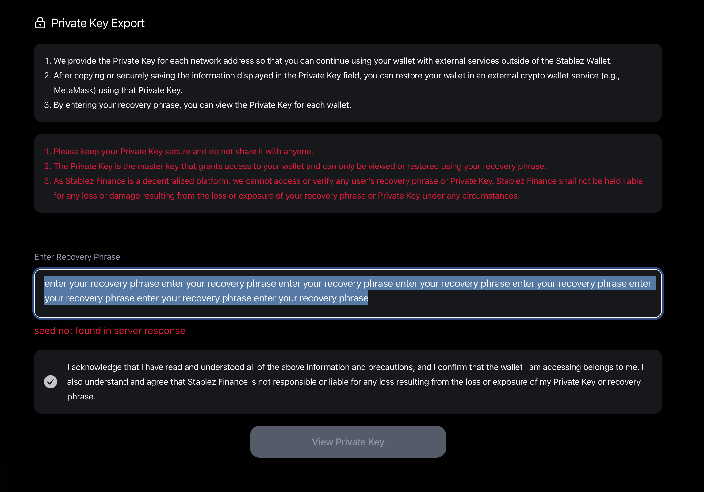 2. Enter your 24 word long Recovery Phrase of the Stablez wallet you would like to export, and select **\[View Private Key]** button<br>