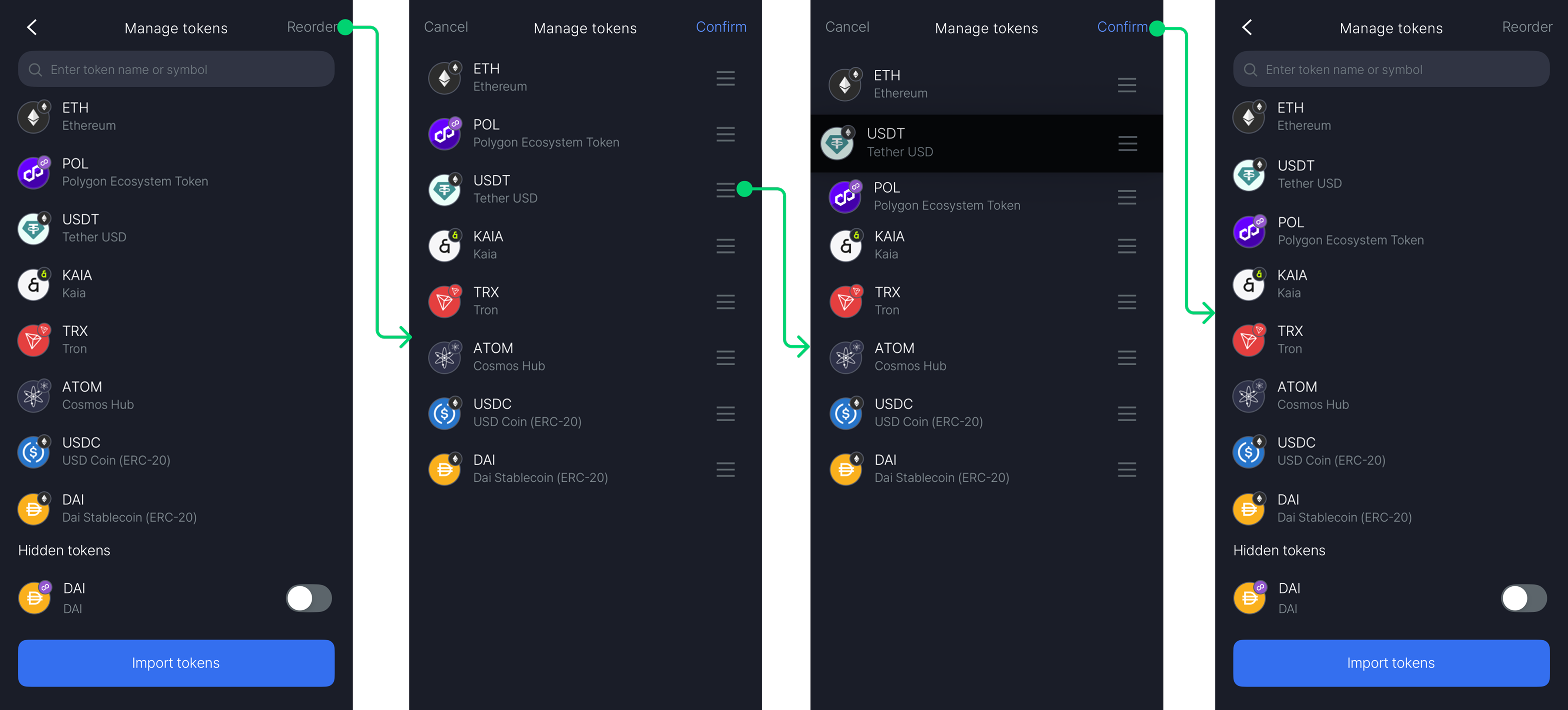 1. Tab **\[Reorder]** button on the top right in the Manage tokens section. Select and hold the token to change the order