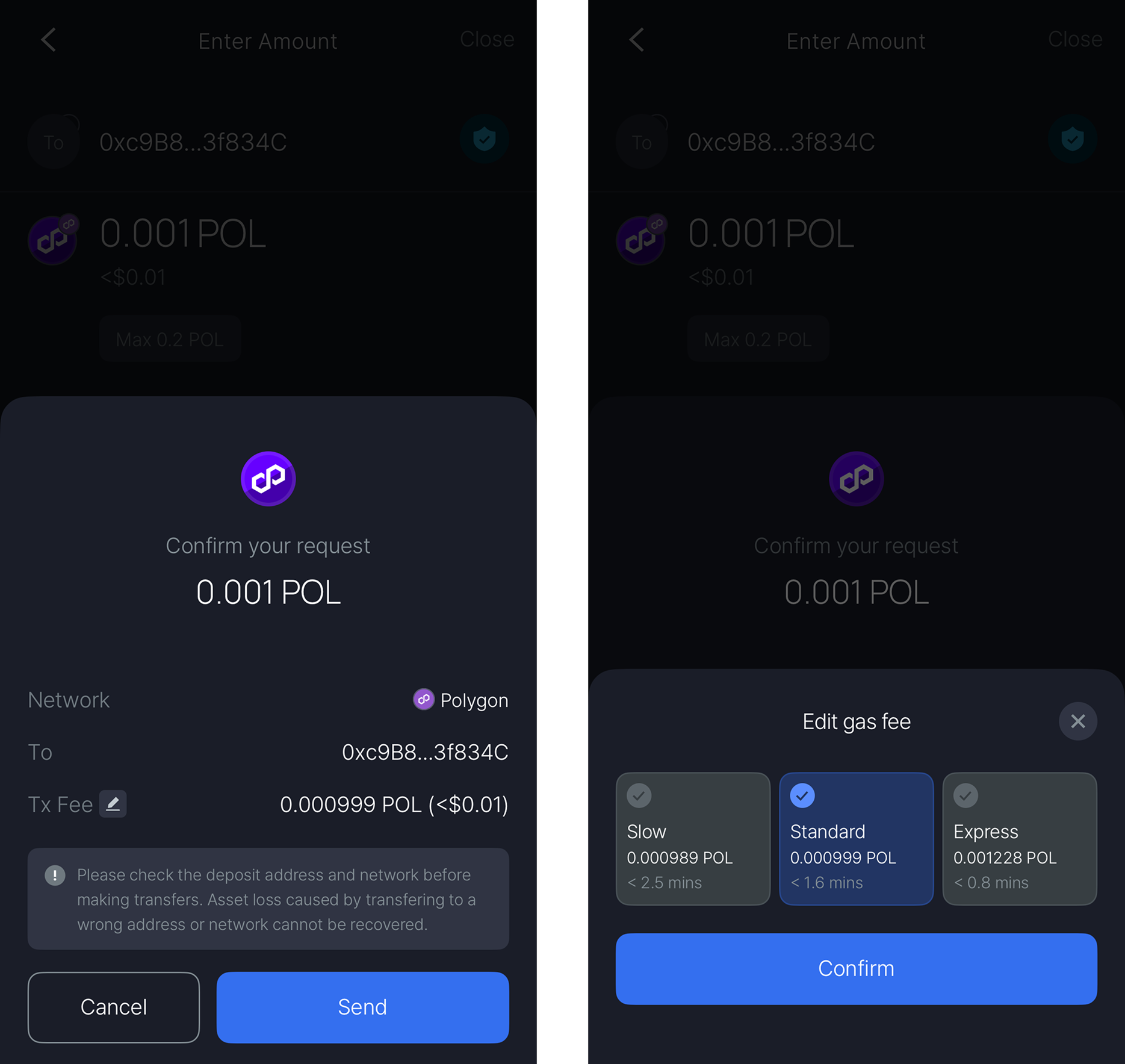 3. Select the gas fee option, “Standard”, “Slow” or “Express”.