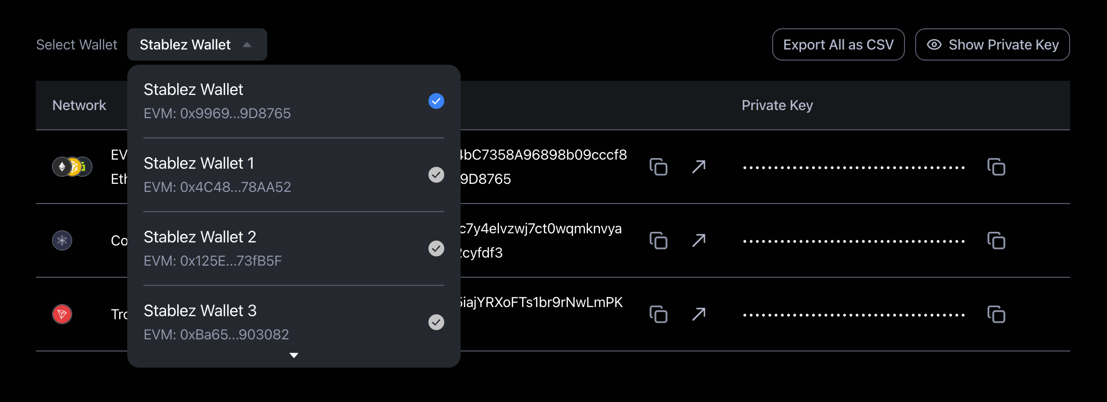 1. Or you can simply export all as CSV which contains private keys of all of your Stablez Wallets