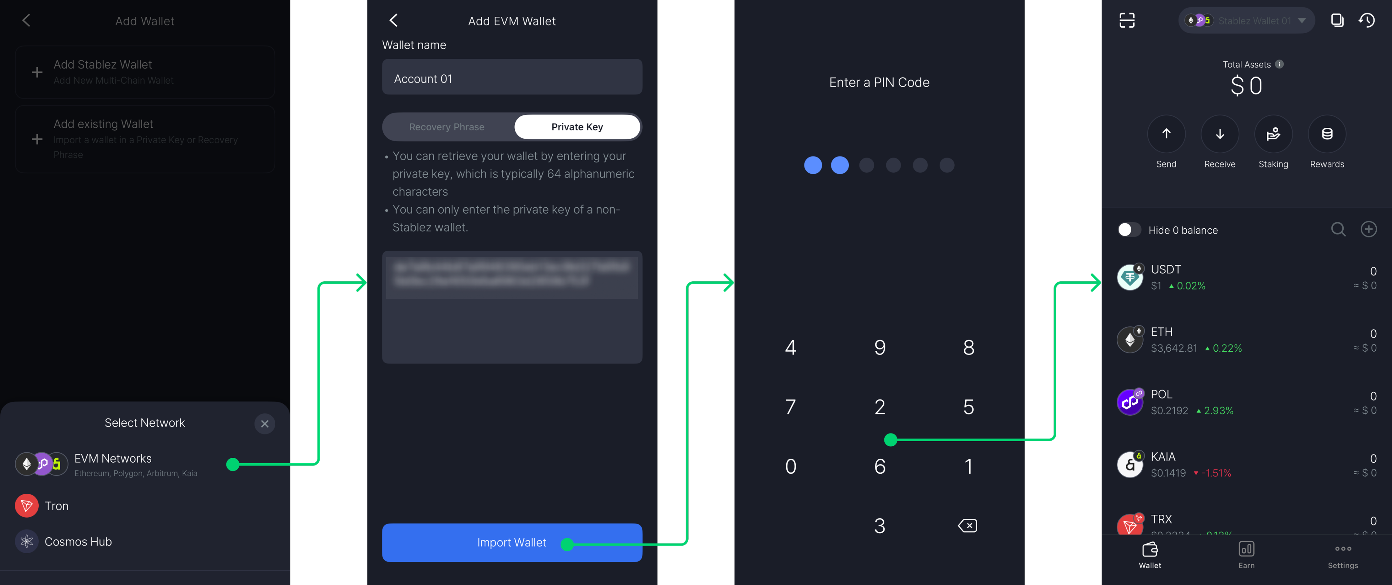 Stablez Wallet supports the import of external wallets using the recovery phrase or private key. You can easily import your existing wallets other than Stablez and manage all your assets within Stablez, a one-stop non-custodial DeFi protocol.